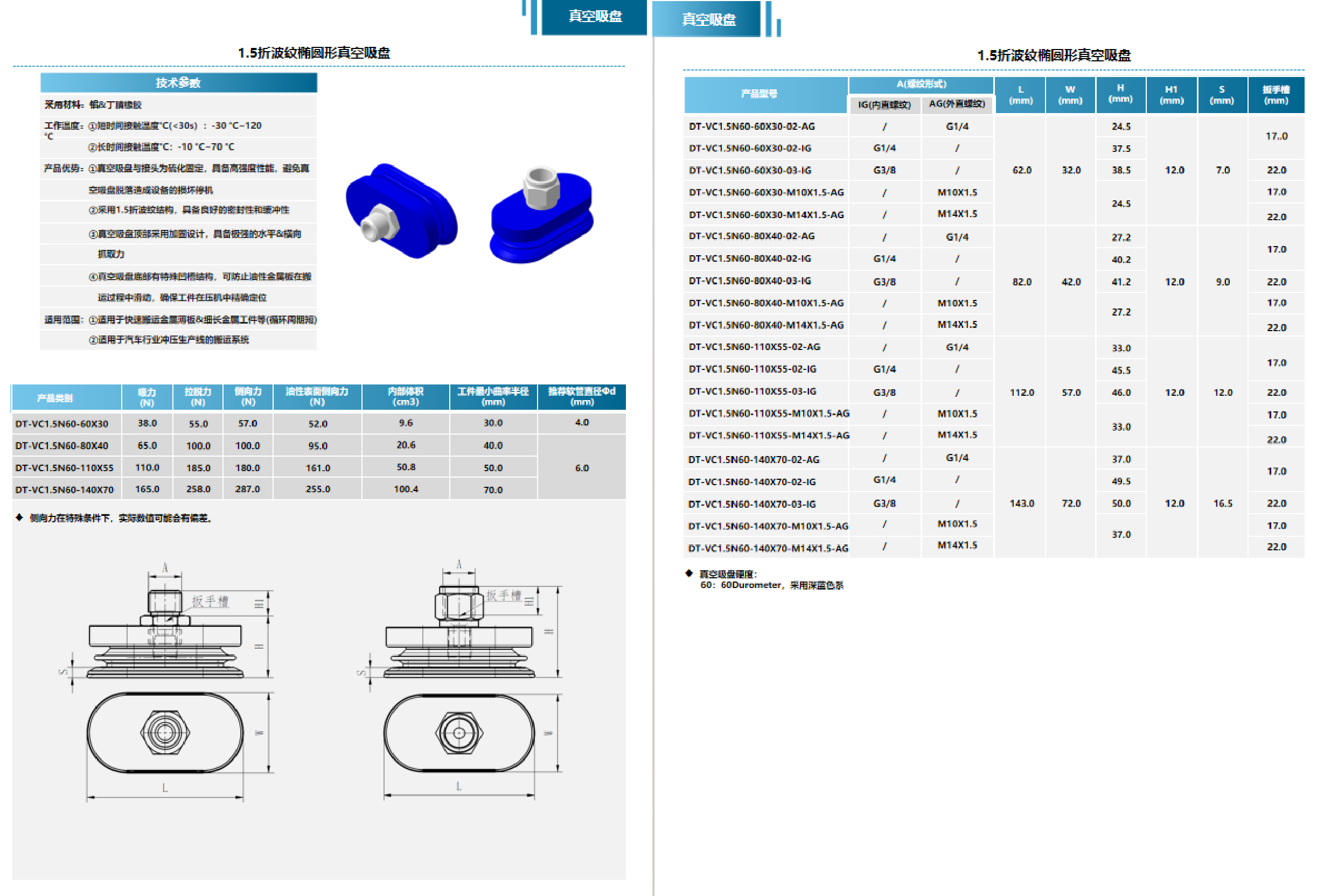 - 产品优势:①真空吸盘与接头为硫化固定,具备高强度性能,避免真 空吸盘脱落造成设备的损坏停机 ②采用1.5折波纹结构,具备良好的密封性和缓冲性 ③真空吸盘顶部采用加固设计,具备极强的水平&横向 抓取力 ④真空吸盘底部有特殊凹槽结构,可防止油性金属板在搬 运过程中滑动,确保工件在压机中精确定位