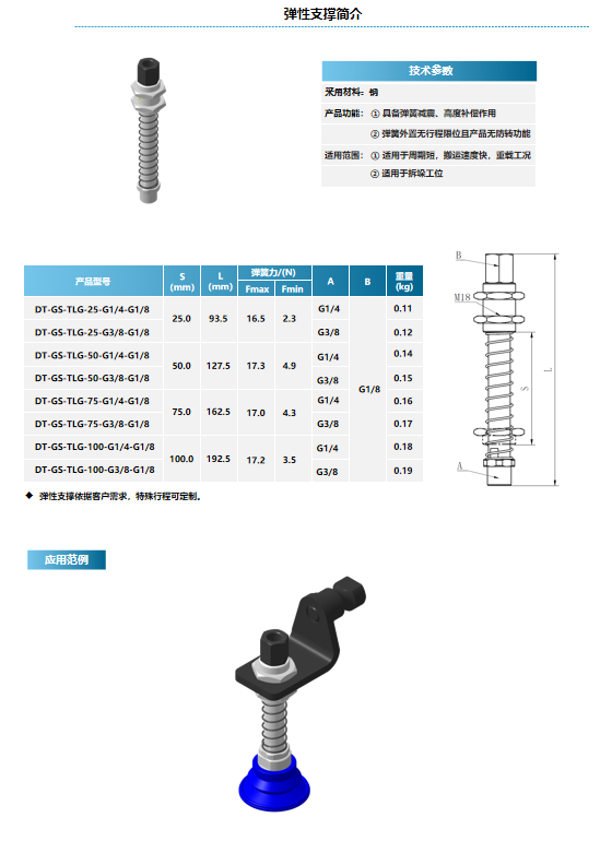 产品功能: ① 具备弹簧减震、高度补偿作用 ② 弹簧外置无行程限位且产品无防转功能