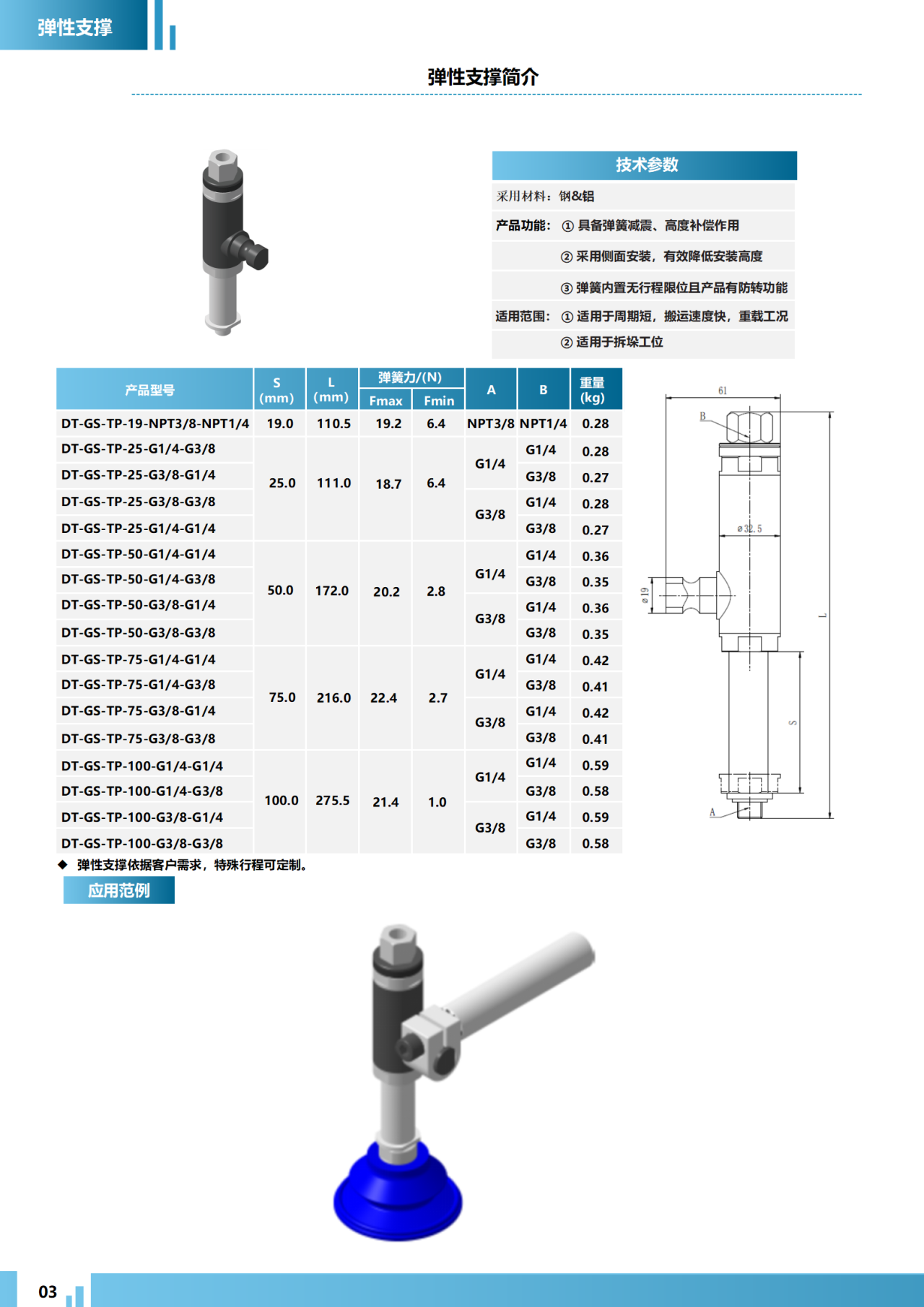 产品特点 采用材料:钢&铝 产品功能: ① 具备弹簧减震、高度补偿作用 ② 采用侧面安装,有效降低安装高度 ③ 弹簧内置无行程限位且产品有防转功能 适用范围: ① 适用于周期短,搬运速度快,重载工况 ② 适用于拆垛工位